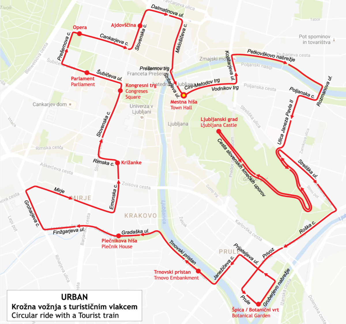 Ljubljana’da bildiğimiz Hop On Hop Off Turu yok. Bunun yerine Urban Treni dedikleri modern römorklu traktör kullanıyorlar. Tren hizmeti LPP tarafından işletiliyor.