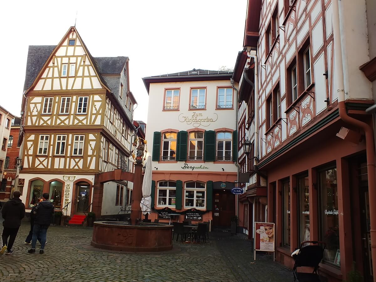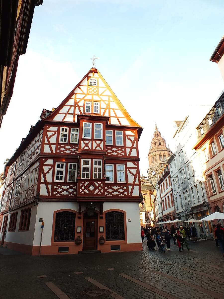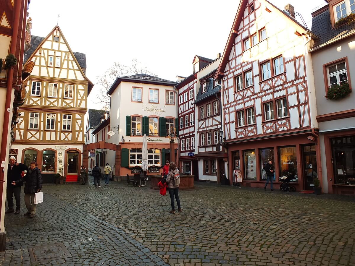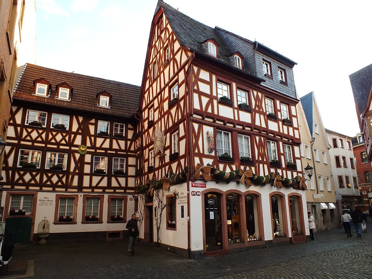 Beyaz sıvalı, koyu kırmızı kirişli, gri arduvaz kaplı üçgen çatılı, bakımlı yarı ahşap evlerin bulunduğu Arnavut kaldırımlı sokaklarıyla eski şehir bölgesi Mainz’ın boynundaki gerçek bir mücevher gibi.