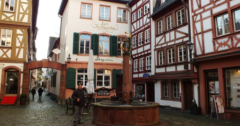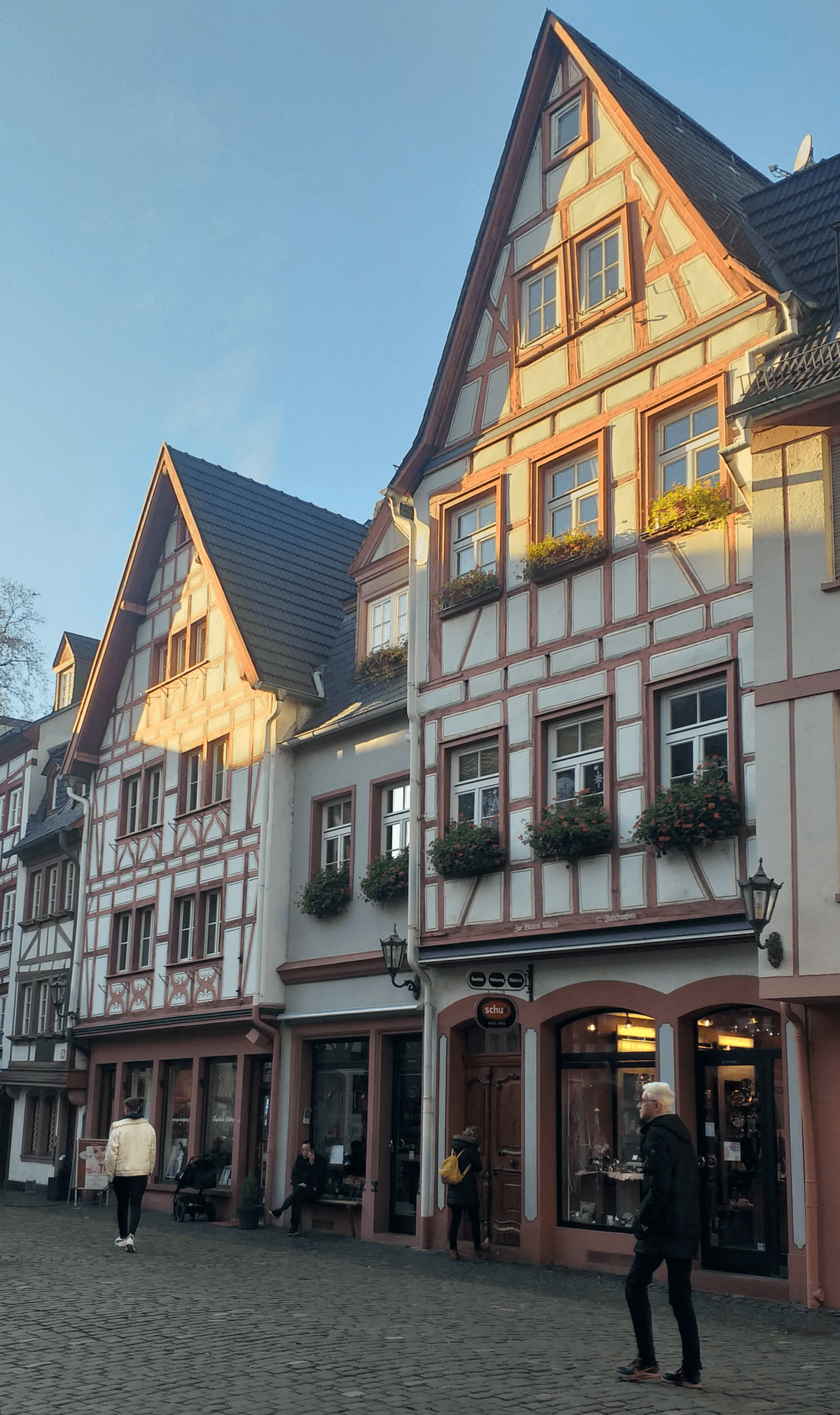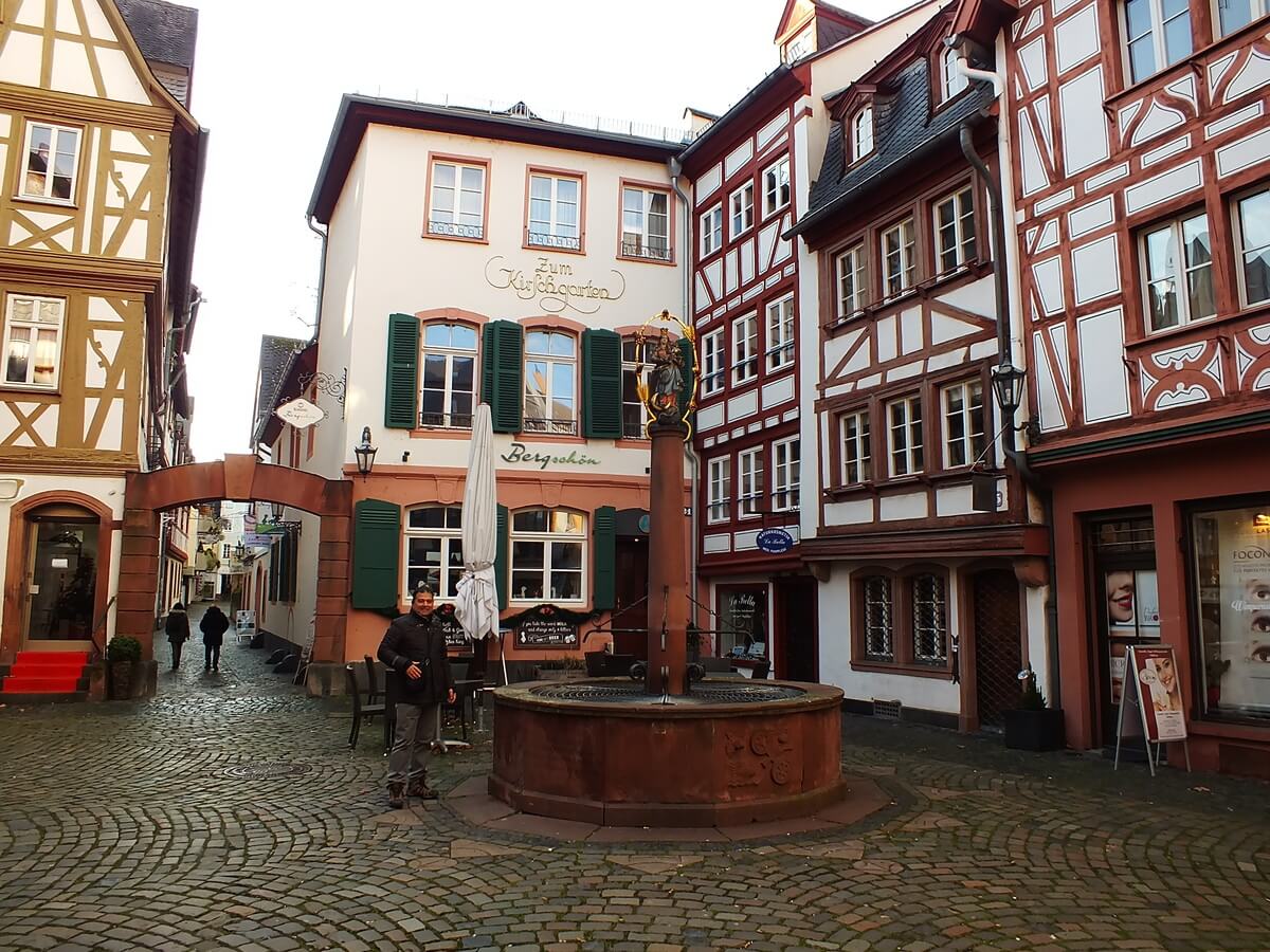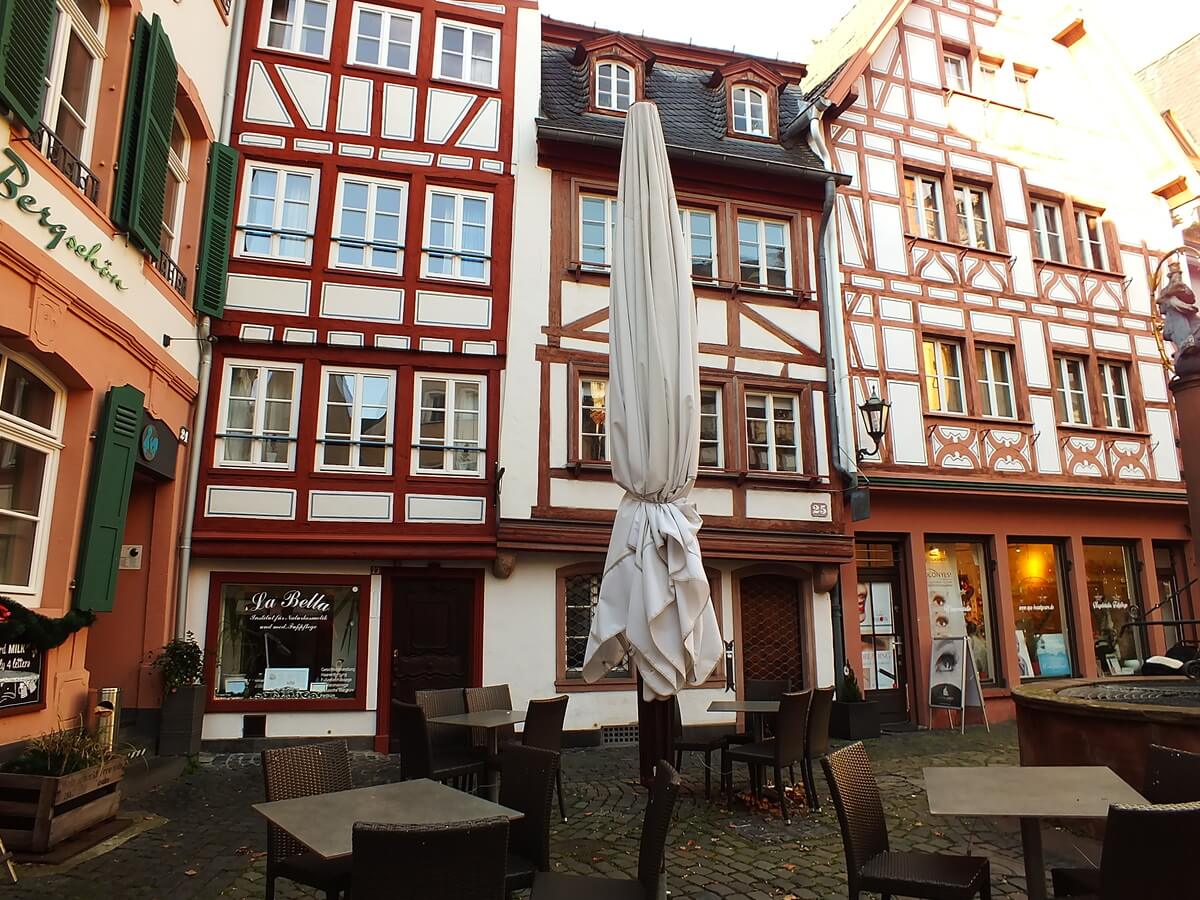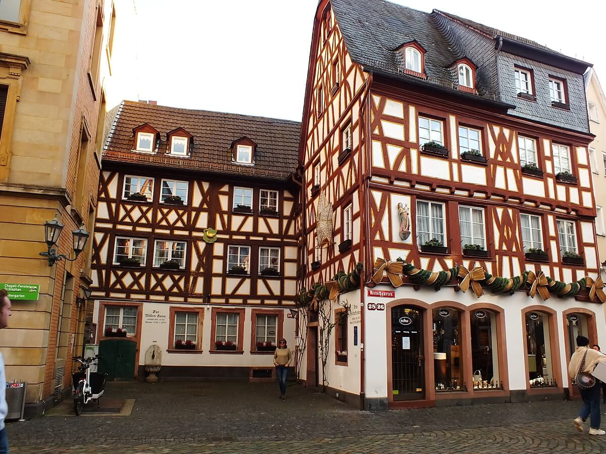Beyaz sıvalı, koyu kırmızı kirişli, gri arduvaz kaplı üçgen çatılı, bakımlı yarı ahşap evlerin bulunduğu Arnavut kaldırımlı sokaklarıyla eski şehir bölgesi Mainz’ın boynundaki gerçek bir mücevher gibi.