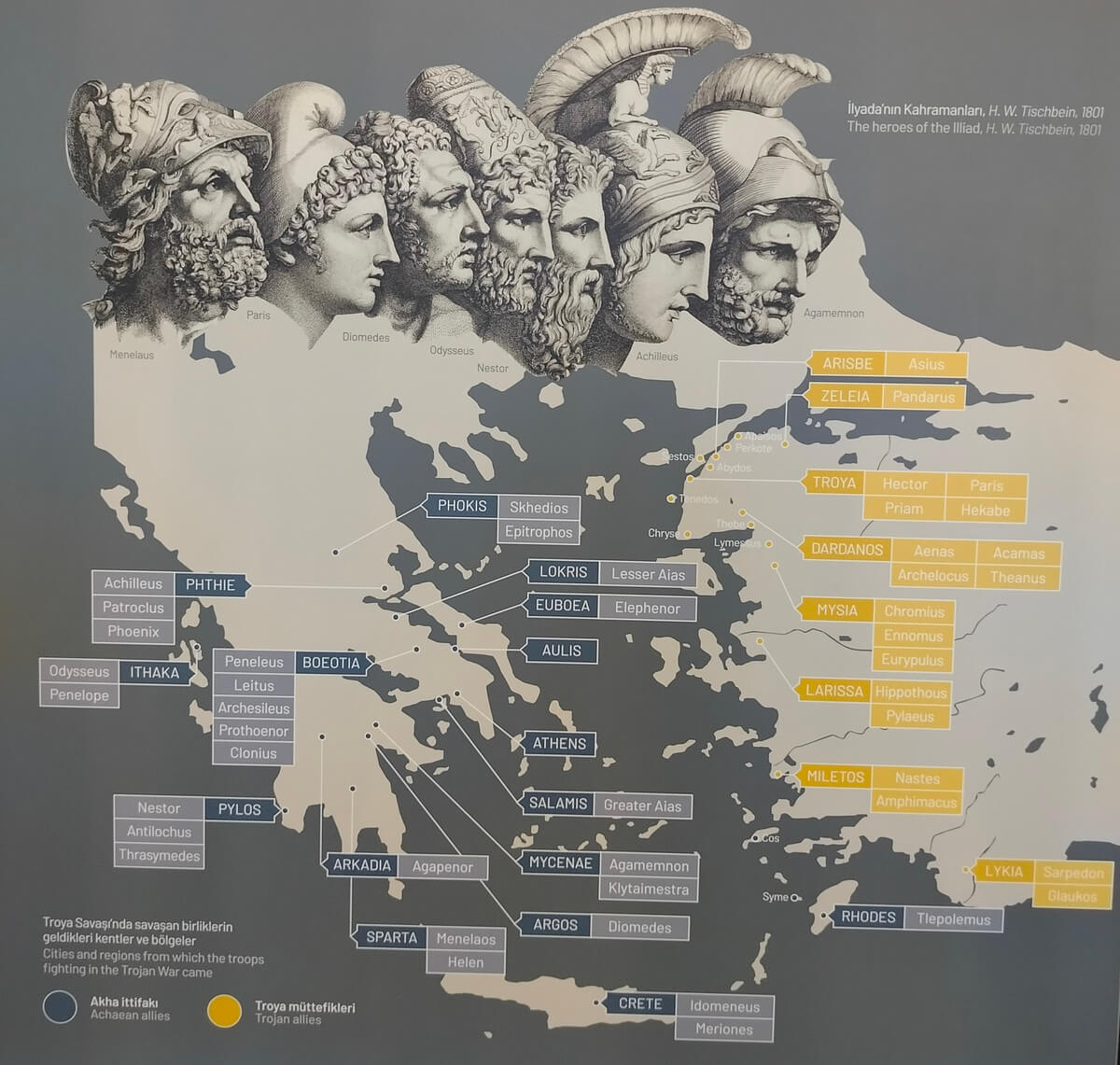 Hektor’un öncülüğündeki Troya’nın müttefikleri Dardanoslular, Sestoslular, Abydoslular, Likyalılar, Karyalılar, Trakyalılar ve Frigyalılar vb. Anadolu’nun 22 farklı bölgesinden gelip Troya ordusuna katılmış. Dardanoslu Aeneas, Likyalı Sarpedon ordularının başındaymış.