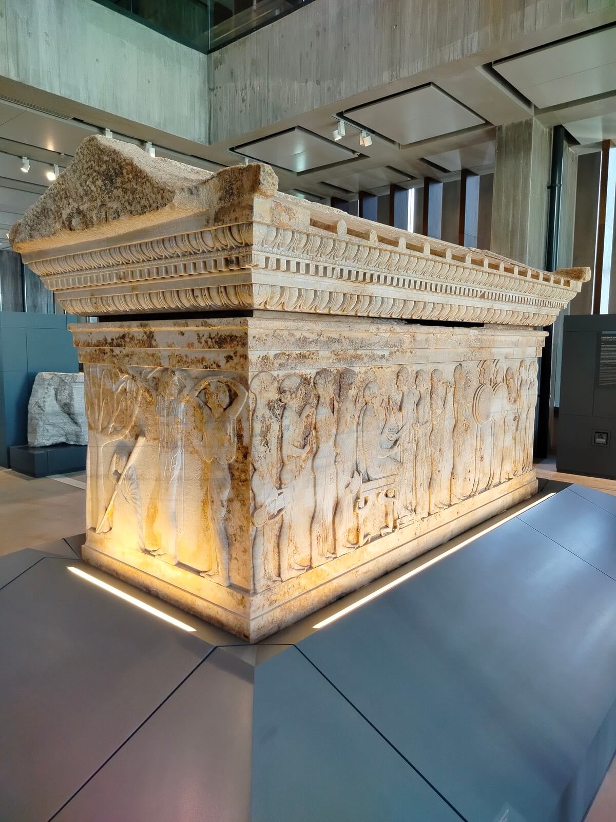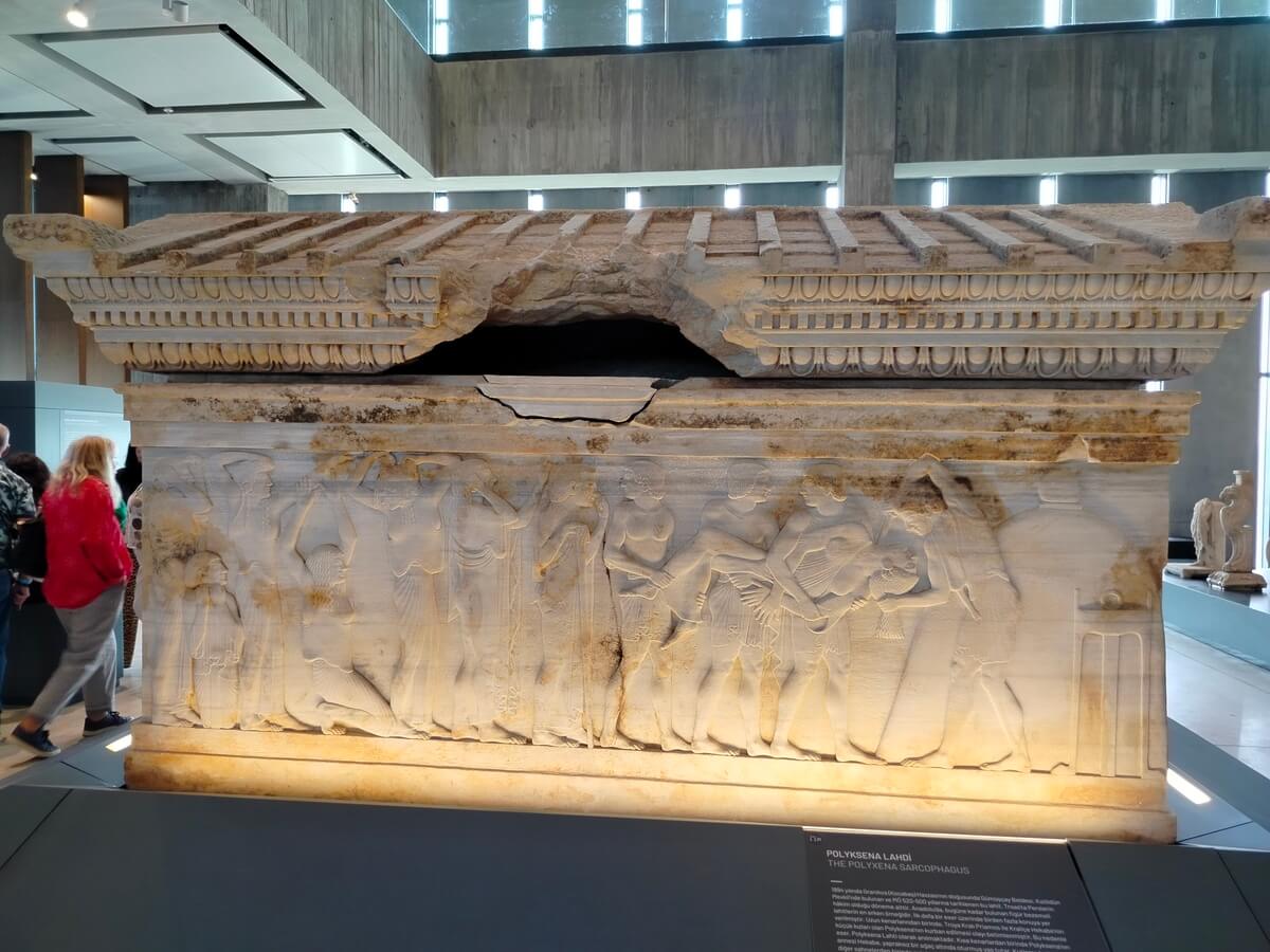 Lahit Anadolu’da, bugüne kadar bulunan figür bezemeli lahitlerin en erken örneği kabul ediliyor. İlk defa bir eser üzerinde birden fazla konuya yer verilmiş. Lahitte 37 figür var. Uzun kenarlarından birinde, Troya Kralı Priamos ile Kraliçe Hekabe’nin küçük kızları olan Polyksena’nın kurban edilmesi olayı betimlenmiş. Bu nedenle eser, Polyksena Lahti olarak anılmakta. Kısa kenarlardan birinde Polyksena’nın annesi Hekabe, yapraksız bir ağaç altında oturmuş yas tutar. Kutlama betimlemeli diğer sahnelerden birinde müzisyenler ve dansçıların eşlik ettiği bir topluluktan hediyeler alan tahta oturmuş bir kadın görülüyor. Lahit üzerinde betimlenenlerin çoğu kadın olmasına rağmen, bu lahitte 40 yaşlarında bir erkek cesedi bulunmuş.
