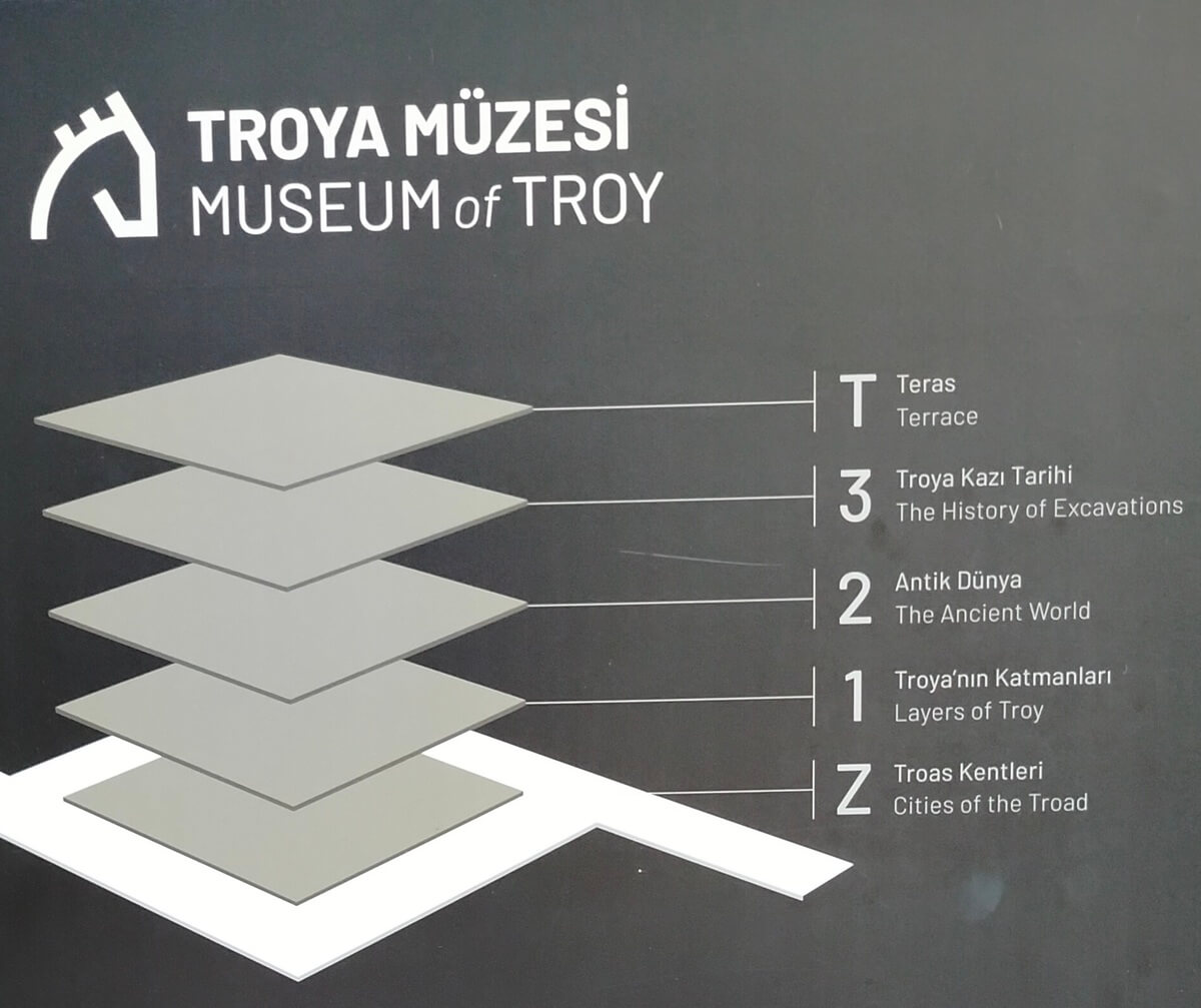 1. katta Troya’nın katmaları bulunuyor. 2. katta Antik Dünya görülüyor. 3. katta Troya Kazı Tarihi bulunuyor. 4. kat ise tüm Troya alanına hakim teras var.