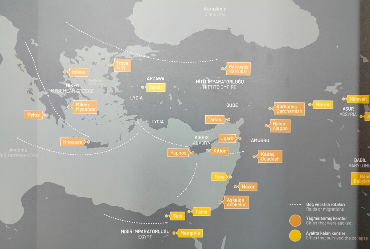 MÖ 1200’den itibaren Doğu Akdeniz’de batıdan ve kuzeyden geldiği düşünülen istilalar Tunç Çağı saraylarının sonunu getirmiş. Miken, Troya, Hitit sarayları; Ugarit, Babil, Elam ülkesi yıkılmış. Mısırlıların “Deniz Kavimleri” dediği bu istilacılar savaşçılardan ve savaşçıların önlerine katıp sürüklediği isyancılardan oluşuyormuş. Deniz Kavimlerine karşı savaşan ve zayıflamasına rağmen ayakta durmayı başaran Mısır’ın o dönemdeki kralı III. Ramses, Medinet Habu’daki mezarının duvarlarına İstilacılara karşı başarısının betimlemelerini yaptırmış.