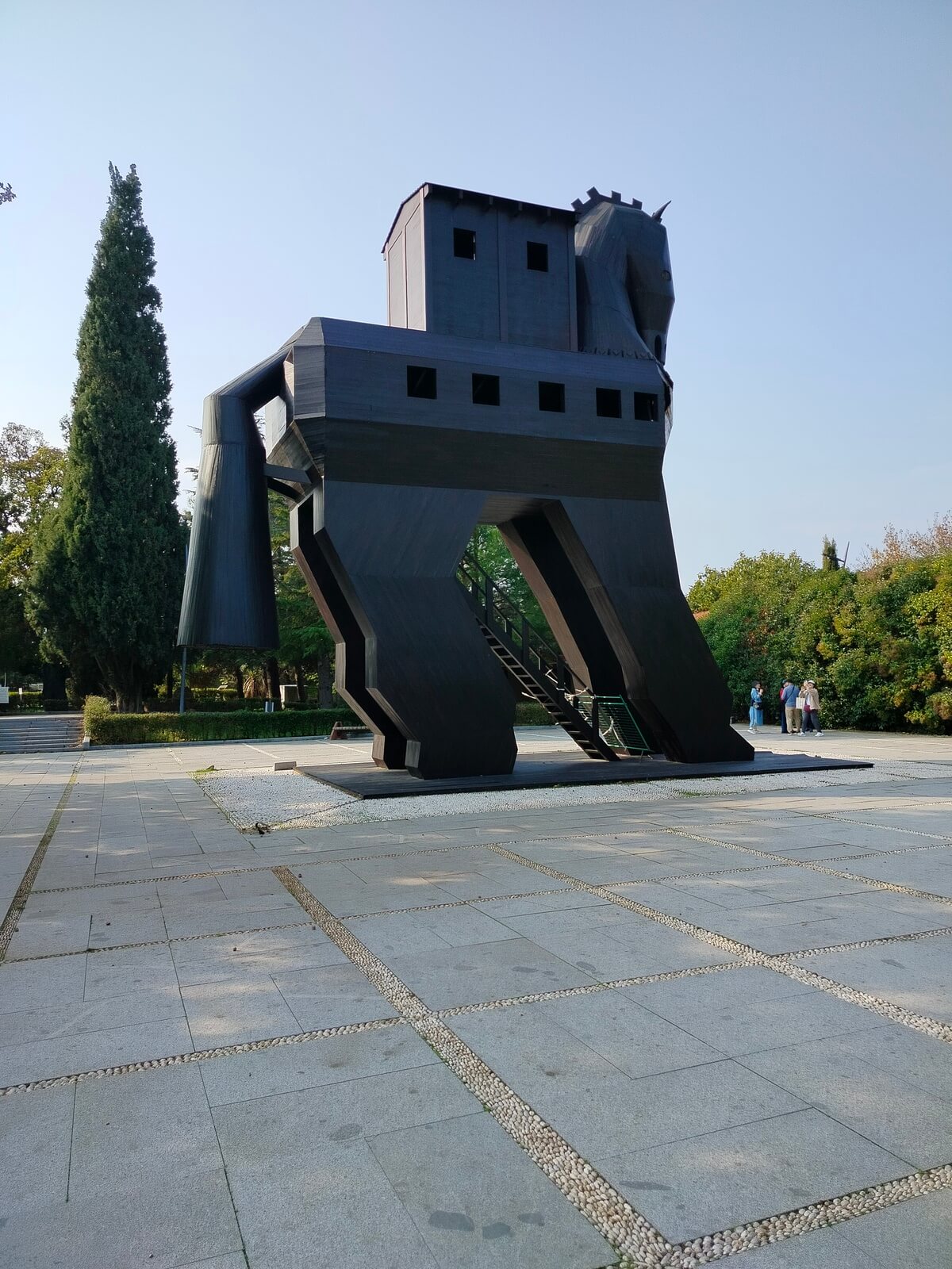 Bu sahneyi hatırlatan tahta at ise 1975 yılında Türk sanatçı İzzet Senemoğlu tarafından tasarlanmış.