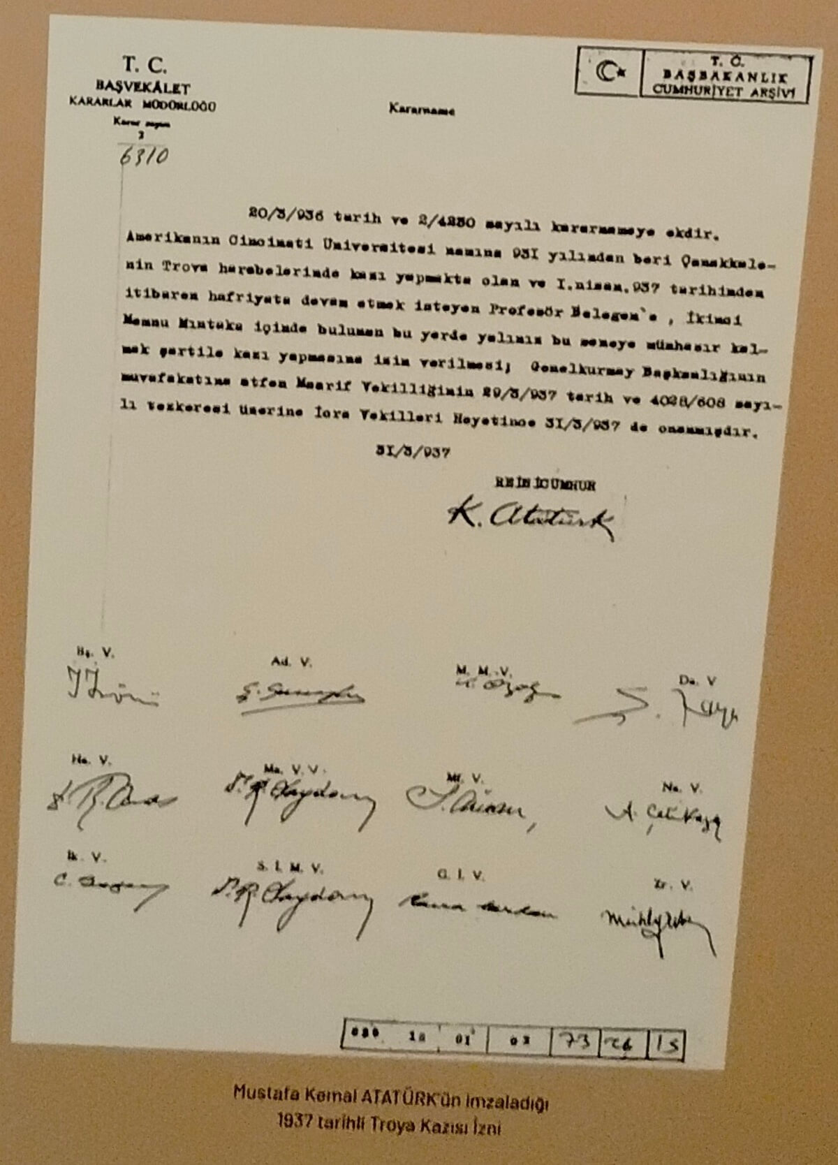 Mustafa Kemal Atatürk konu ile ilgili bizzat ilgi göstermiş. Müze de 1933 ve 1937 tarihli bizzat Mustafa Kemal Atatürk tarafından Carl Blegen için ilk arkeolojik kazı izin yazıları da bulunuyor.