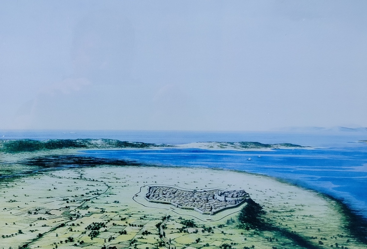 Gördüğünüz görüntü Troya kalesi ve aşağı kentinin MÖ. 13. yüzyıl (Troya VI) rekonstrüksiyonu. Homeros’un İlyada’sındaki Bozcaada ve Gökçeada (Tenedos-Imbros) ve Semadirek Adası’nın zirvesinin güney doğudan görünüşü o dönemler bu şekildeymiş.